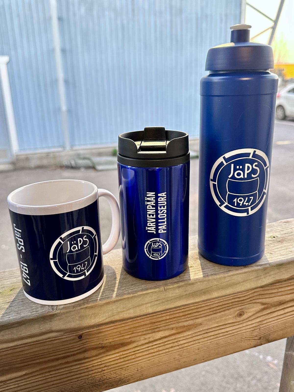JäPS termosmuki | 15,00 | tyylikäs tummansininen termosmuki logolla ja tekstillä |