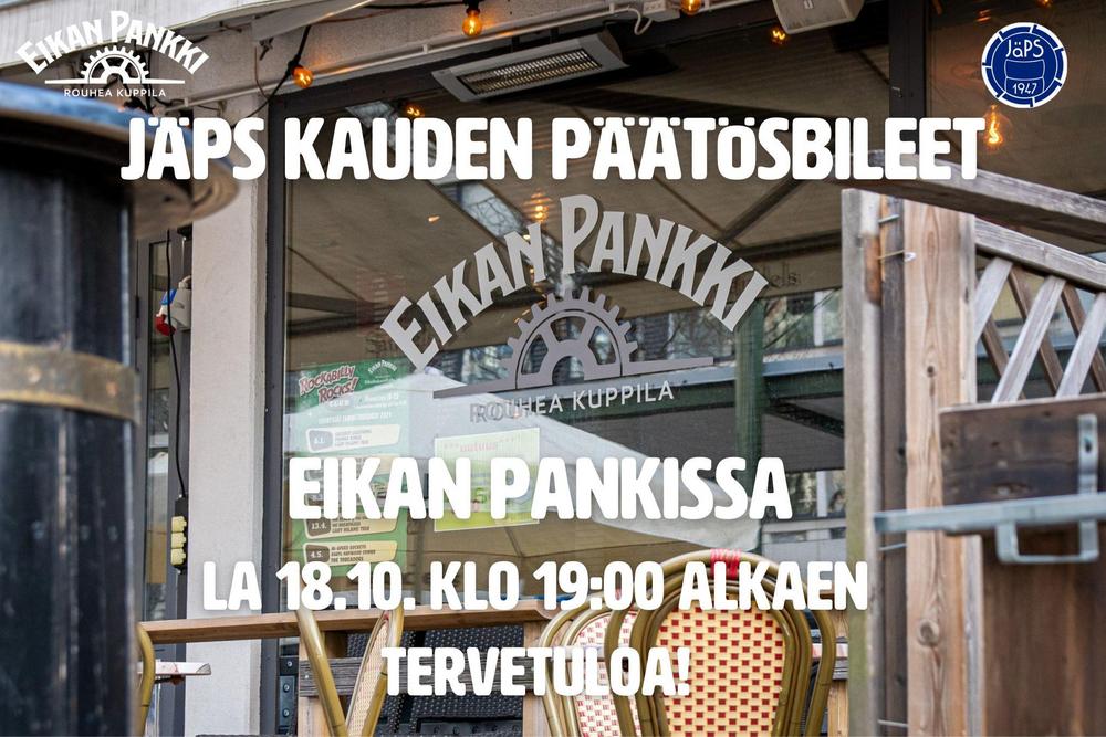 Kauden K-18 päätösbileitä vietetään Eikan Pankissa la 18.10.2025 klo 19:00 alkaen. Koko JäPS-yhteisölle ja kaikille JäPSin kannattajille lämpimästi tervetuloa viettämään mukavaa iltaa, ja käymään läpi kauden kohokohdat ja muut syksyn kuulumiset!